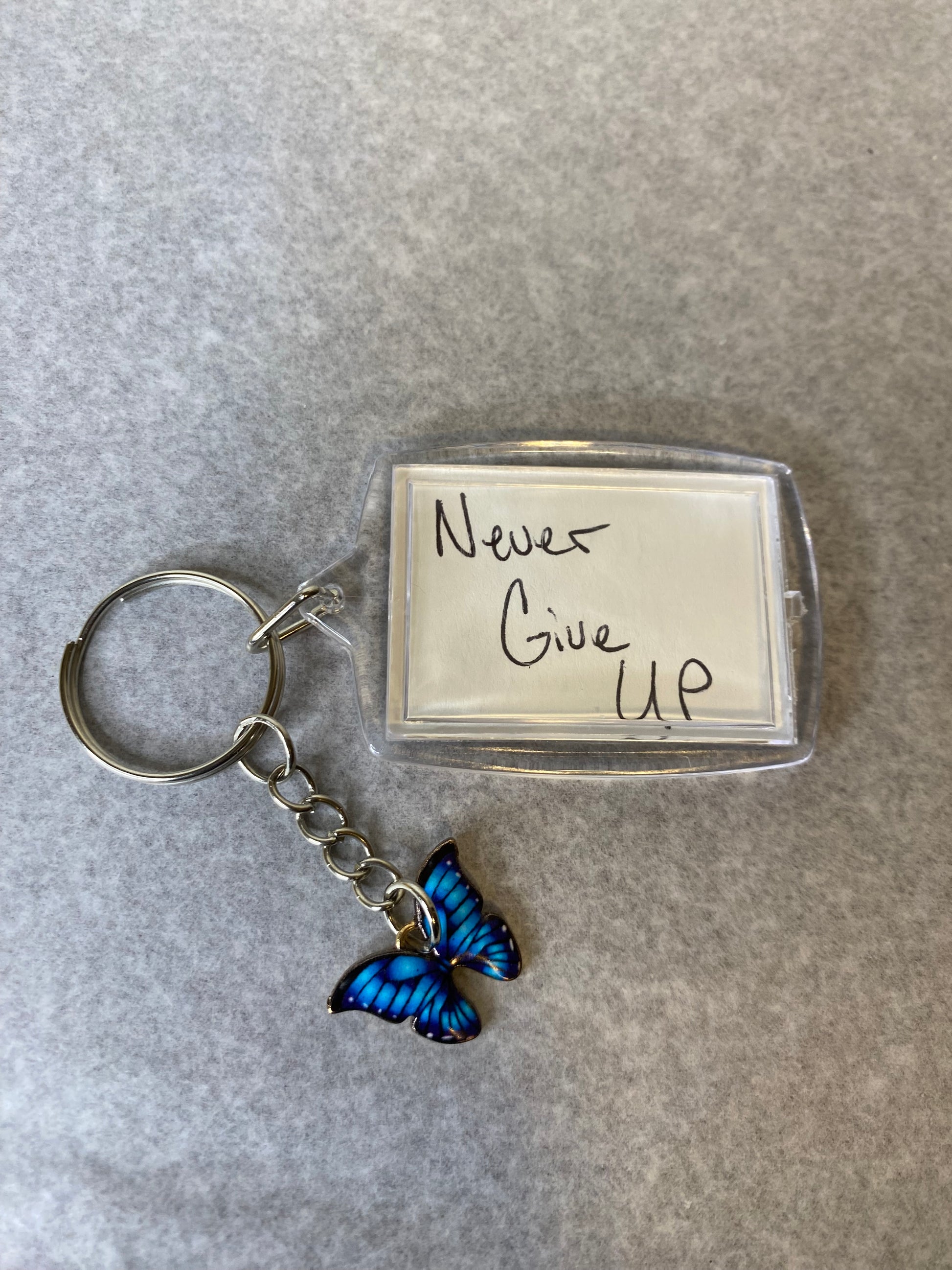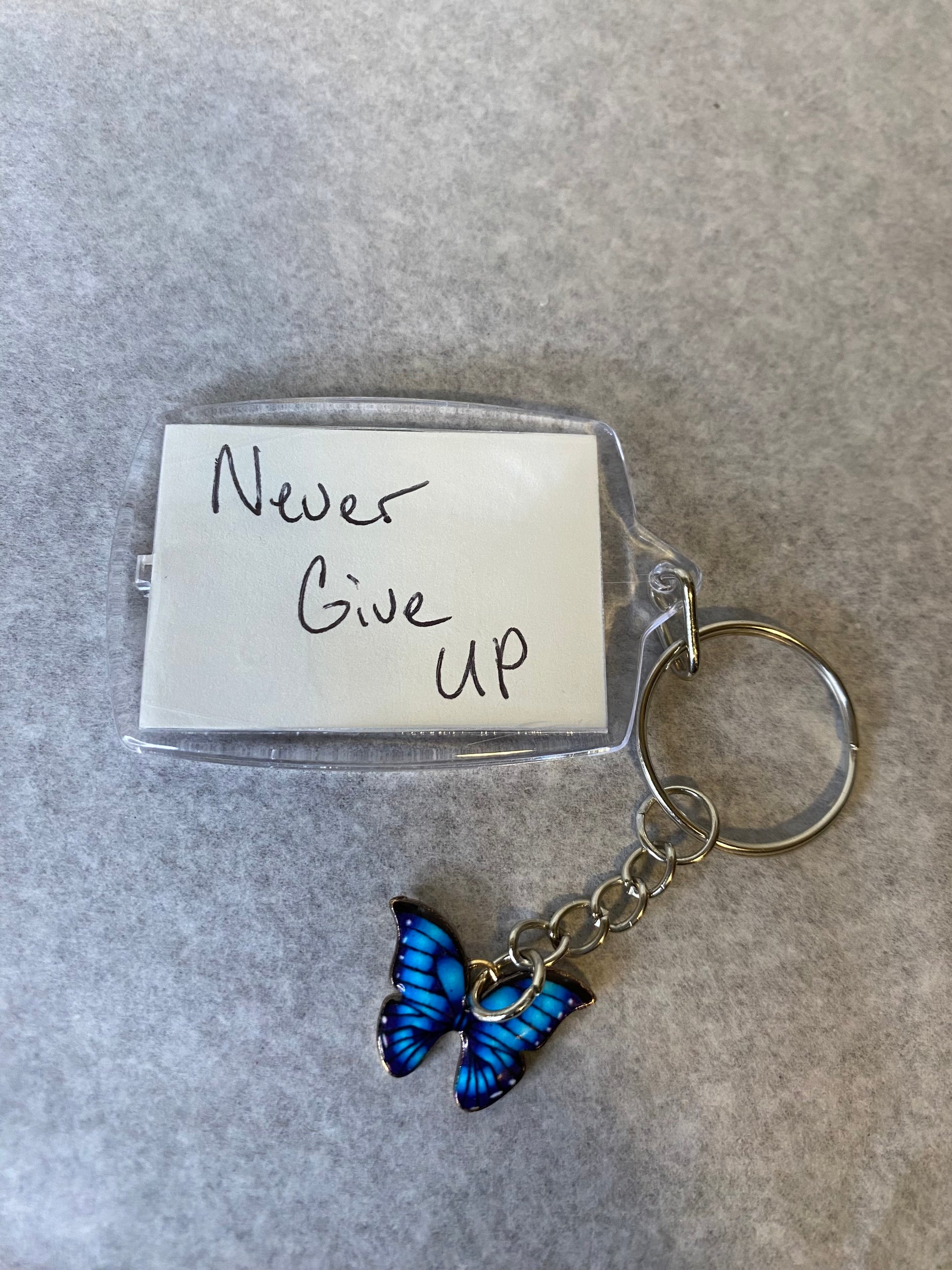 A steadfast reminder to persevere through life's challenges. This 'Never Give Up' keychain features a delicate butterfly charm, symbolizing strength, endurance, and unwavering determination. Carry it daily to inspire persistence, or gift it to someone who could use a motivational boost to keep pushing forward.